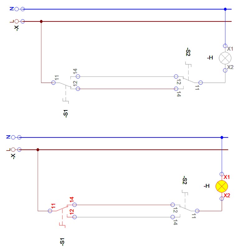 Cuando se pone otro encendido para la la misma lámpara, se usan los conmutadores, se usan 2 cables para unirlos entre si y en uno se pone la fase y en el otro el vuelta de lampara.