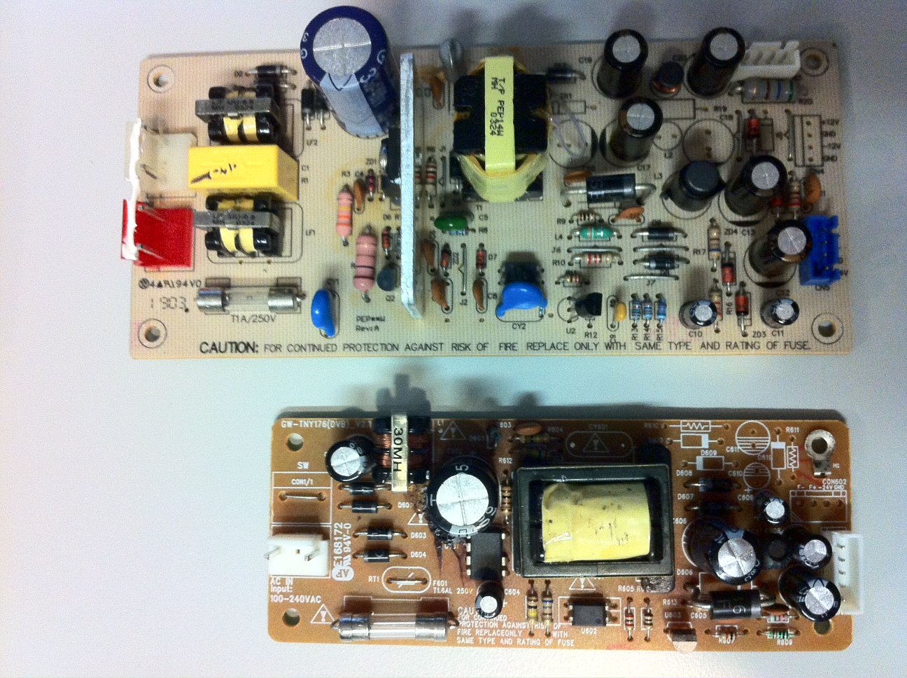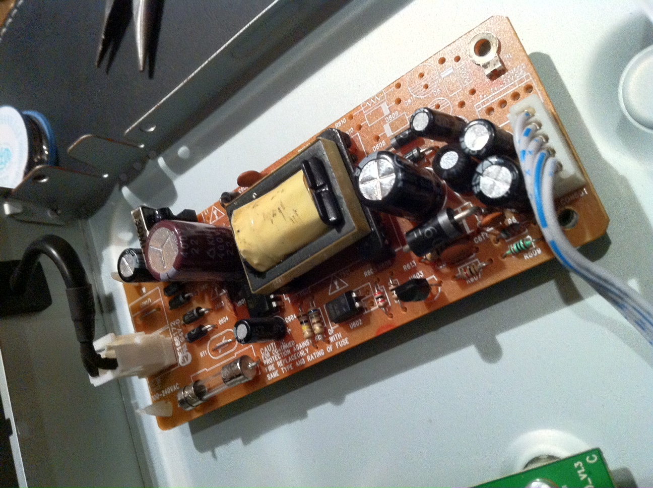 La semana pasada, sin aviso, dejó de funcionar, primero no respondía al mando ni botones físicos y luego terminó por no encender. Cuando lo abro, creo que en la fuente de alimentación hay un par de condensadores que parecen en mal estado y acudo a tienda de repuestos para ver si puedo conseguir esos condensadores. El problema es que uno de ellos me dicen en dos tiendas que no lo tienen porque puede ser fabricado "sólo para ellos", pone en el lateral del grande mdtcom 15μF400v 105ºc que tiene una mancha negra en la base, como un reventón y el pequeño 1000μF 16v que está hinchado. Como no me encuentran el primero, el camino acaba ahí...
