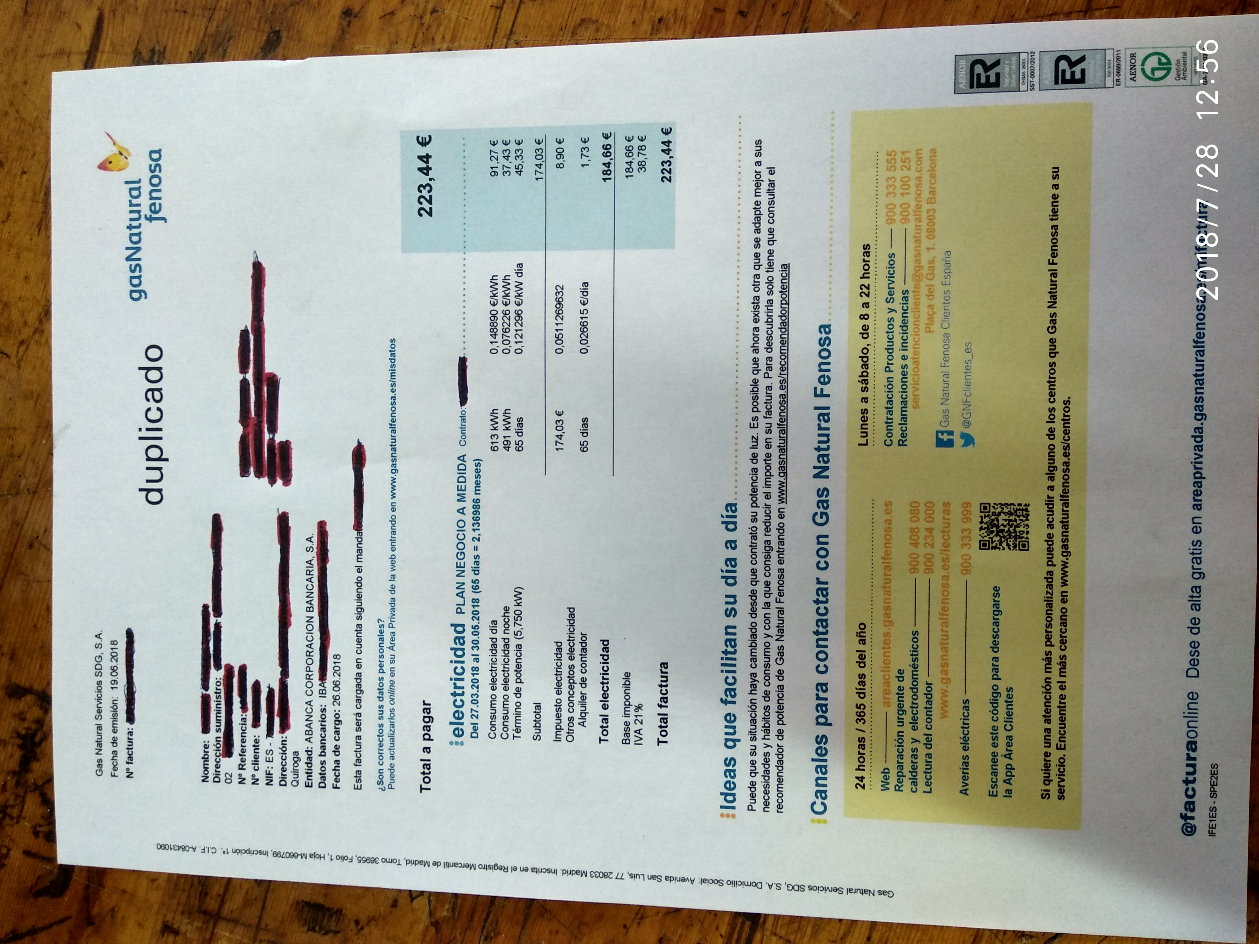 En la factura de junio = 223€
