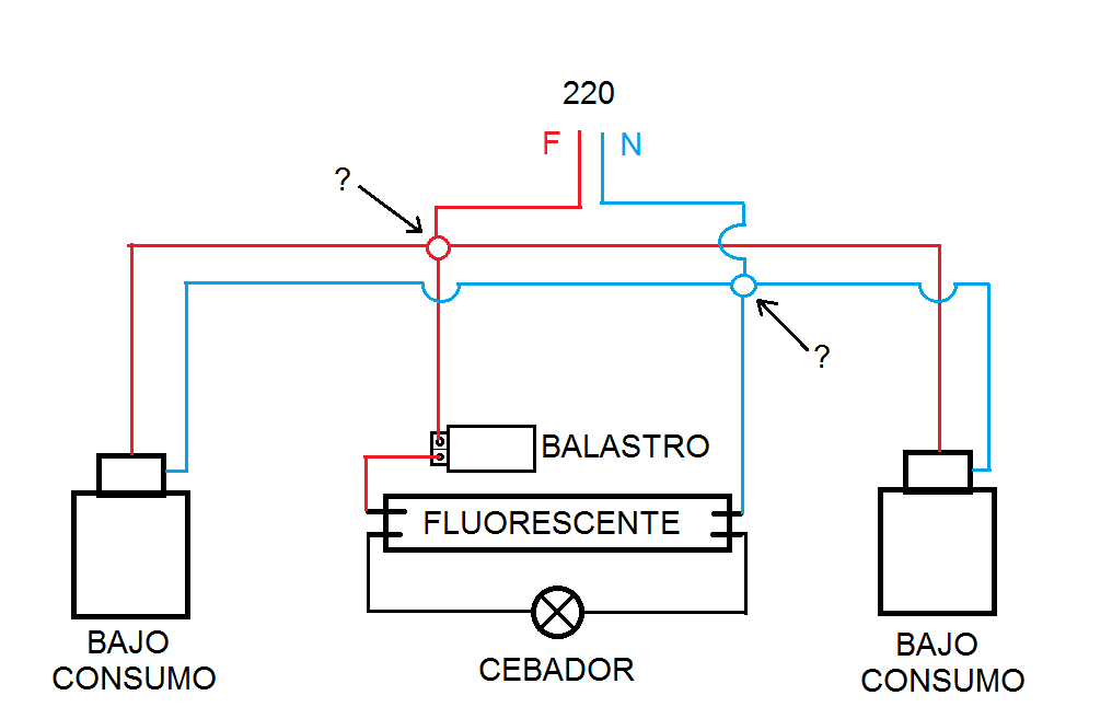 2 de ellas son de bajo consumo de 40W y la 3ra es un tubo fluorescente de 36W con un balastro de 40W.