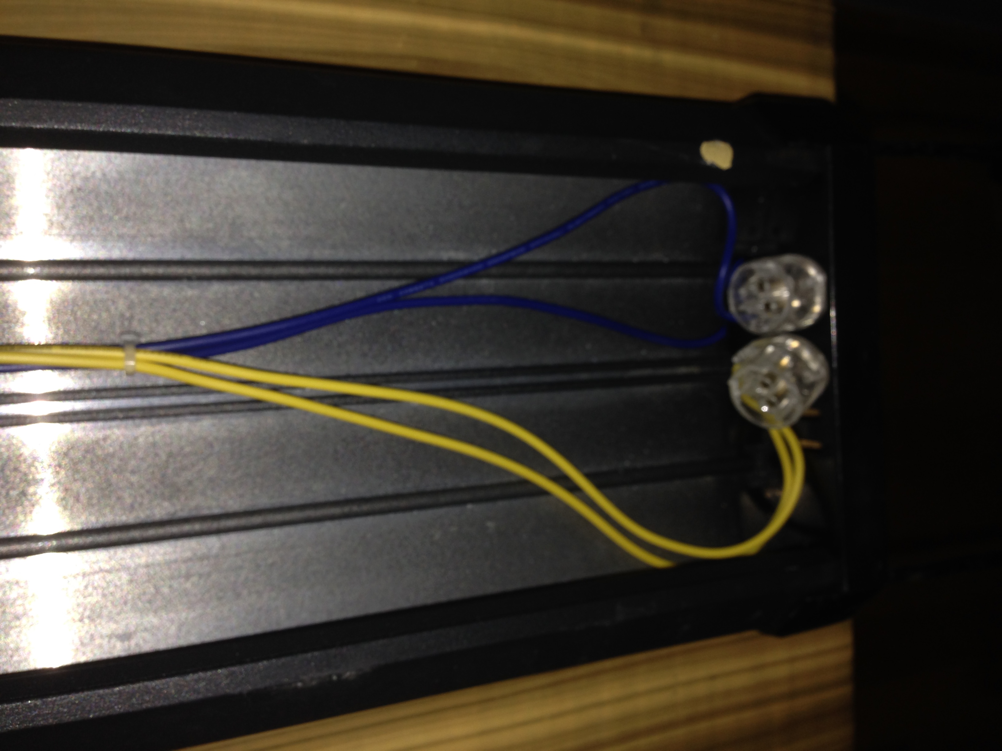 -Cable azul oscuro y marron, coges dos zócalos, para el mismo tubo, de cada zocalo, unes sus cables y a esa unión le conectas el azul oscuro. Lo mismo con el otro zocalo y conectándole el cable marron.