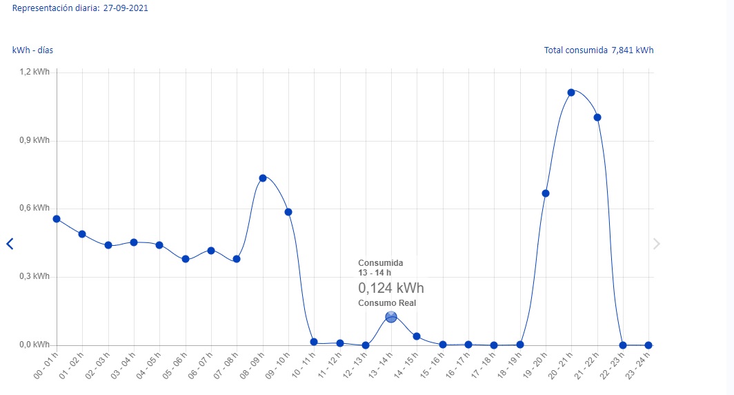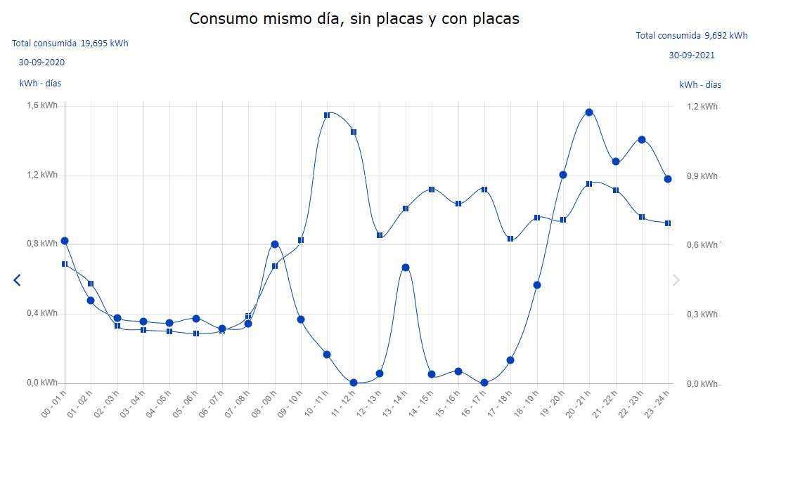 El 27 de Septiembre de 11 de la mañana a 7 de la tarde, casi 0Kw de consumo del contador, menos cuando hicimos la comida con una olla eléctrica y además estaba puesto el lavaplatos, porque les hacia ilusión ponerlo un lunes a las 2 de la tarde, que hacia tiempo que no se ponía.