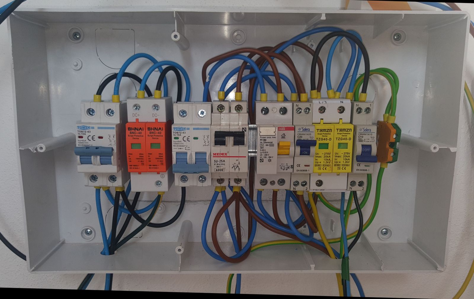 En la foto se ve que no esta del todo cableado, pero a día de hoy esta funcionando y dando una media de 12Kw cada día, lo cual esta muy bien con menos de 2.000W de placas.