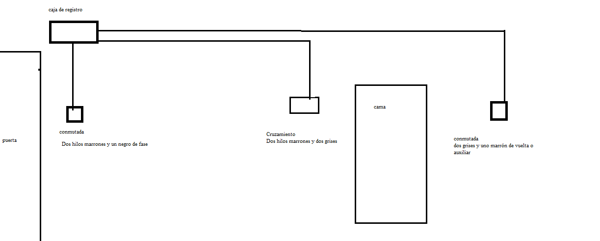 el primer conmutado va al lado de la puerta ,en la entrada de la habitacion, el cruzamiento va a un lado de la cama en la mesilla y el otro conmutador en el otro extremo de la cama para poder apagar desde el cbzero, la caja de registro esta al lado de la puerta de entrada en la parte superior.