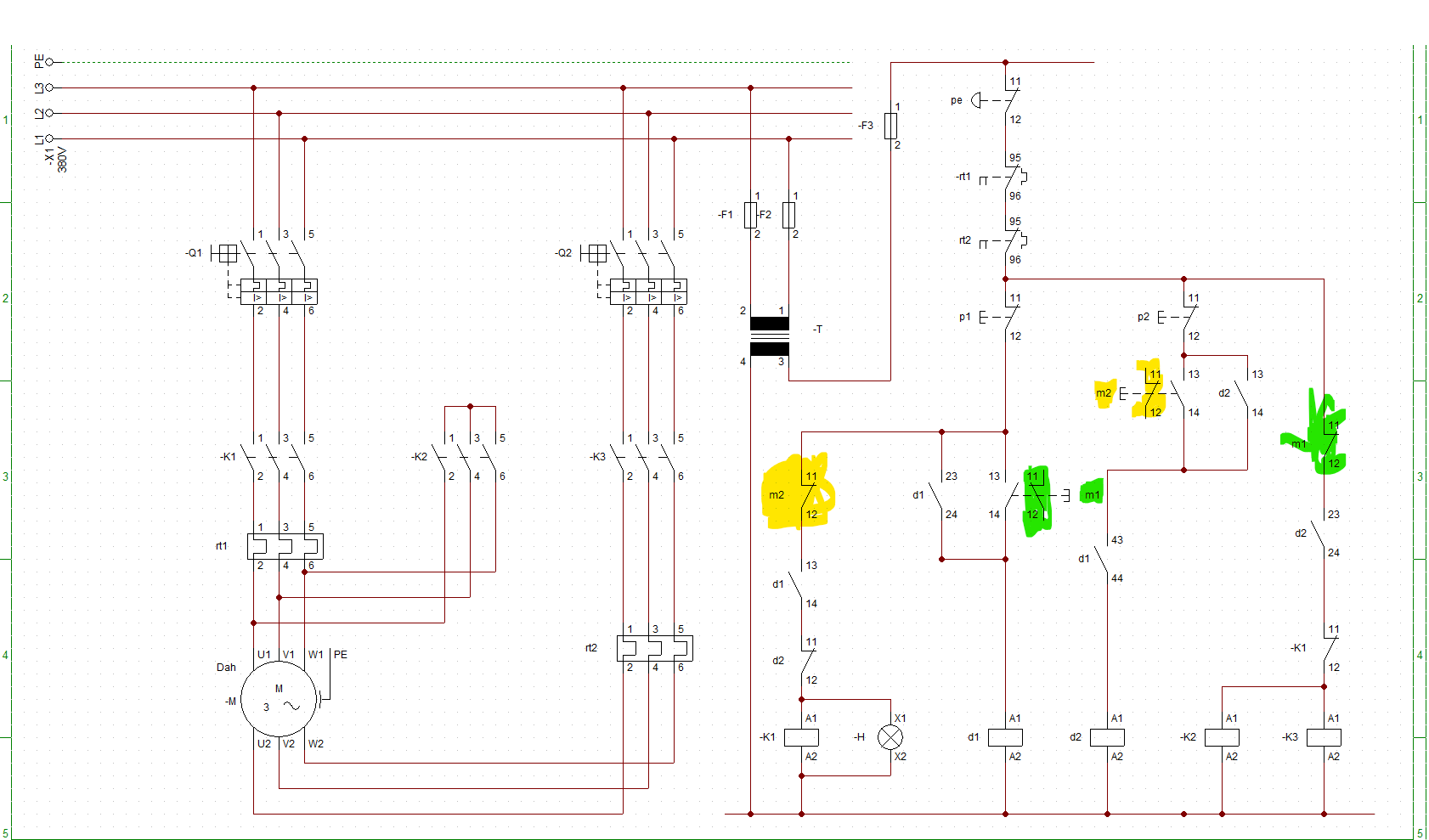- Pulsador S1 arranca el motor en velocidad baja, pulsador S2 cambia la velocidad del motor a velocidad rápida ( para que funcione en velocidad rápida ha tenido que estar primero en velocidad lenta ), con S1 si esta en velocidad lenta al pulsarle debe pasar de nuevo a velocidad lenta.