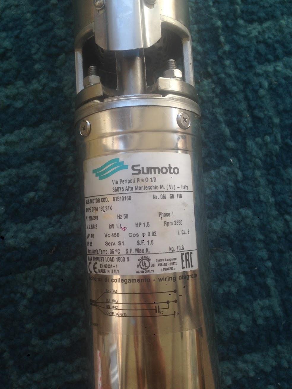 Tengo instalada una bomba de 1,5 Cv en un pozo de sondeo. Es de 220V y el tercer cable lo tengo conectado mediante un condensador como indica su instrucciones.