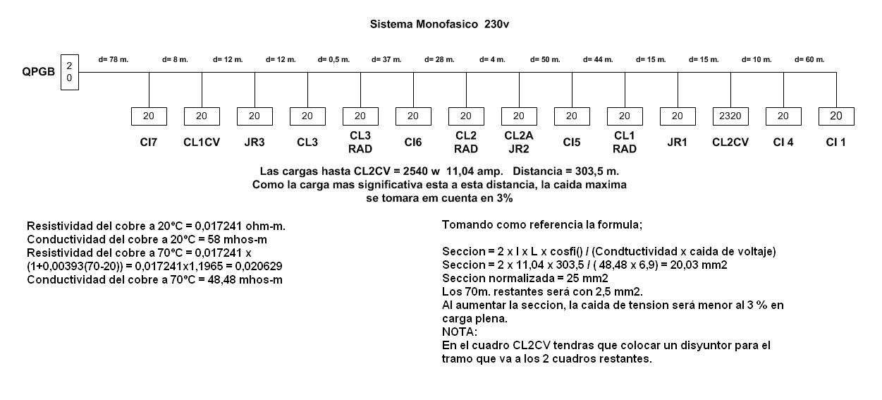 Entonces con estos valores aplicando... caida en voltios / ( amp x long(km) te vas a las tablas y encuentras la seccion de cada tramo.