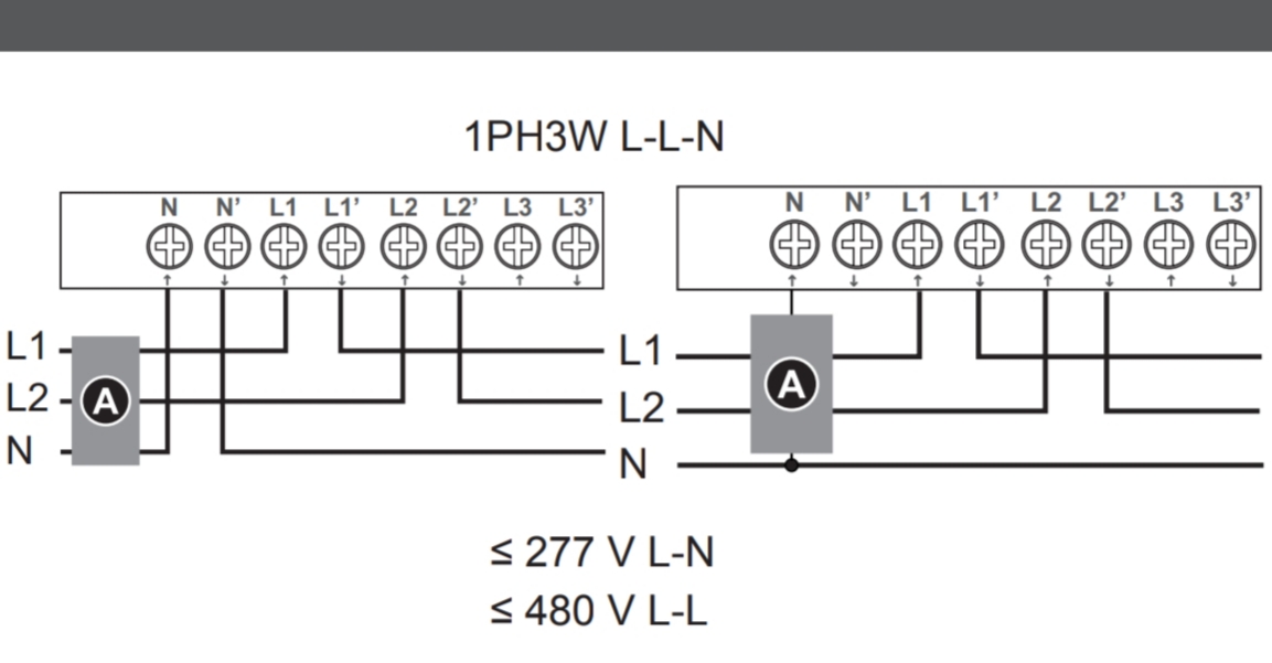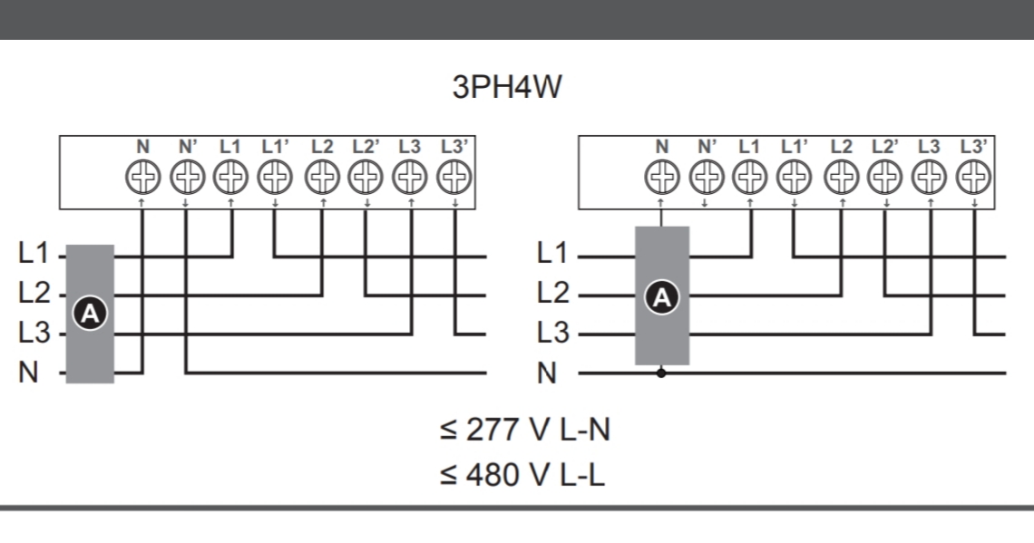 El contador, según el manual, lleva el neutro conectado. Quizá lo que desconcierta es en la imagen de la derecha, el neutro no pasa por el contador, pero hay una derivación del neutro hasta el borne neutro del contador. Pero no se ve bien por que hay el bloque A que lo tapa. Este bloque según el manual, representa un interruptor con fusibles.
