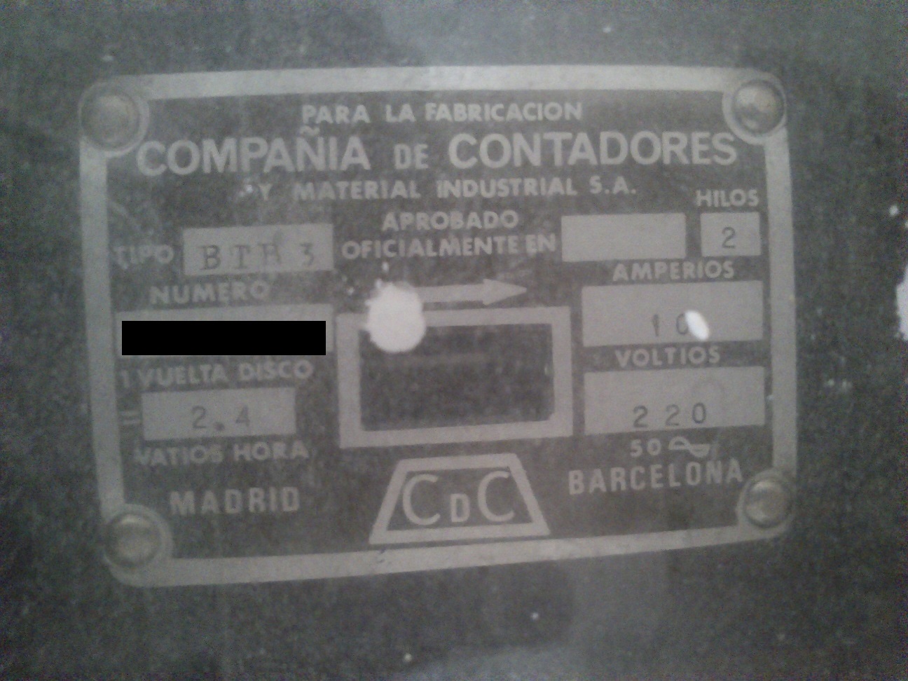 Por cierto, veo que tu contador es antiguo de verdad. A mi me encantan los fabricados por Compañía de Contadores. Del modelo BTR3 como el tuyo tengo dos o tres, también tengo alguno del BTR5 que es un modelo ligeramente mas moderno, se diferencia por que la placa de características es estrecha y alargada, de estos tengo uno con tapa de vidrio. La diferencia es que casi todos los que yo he visto de estos son para 127 en vez de 220 V, aun que también de estos alguno he visto.