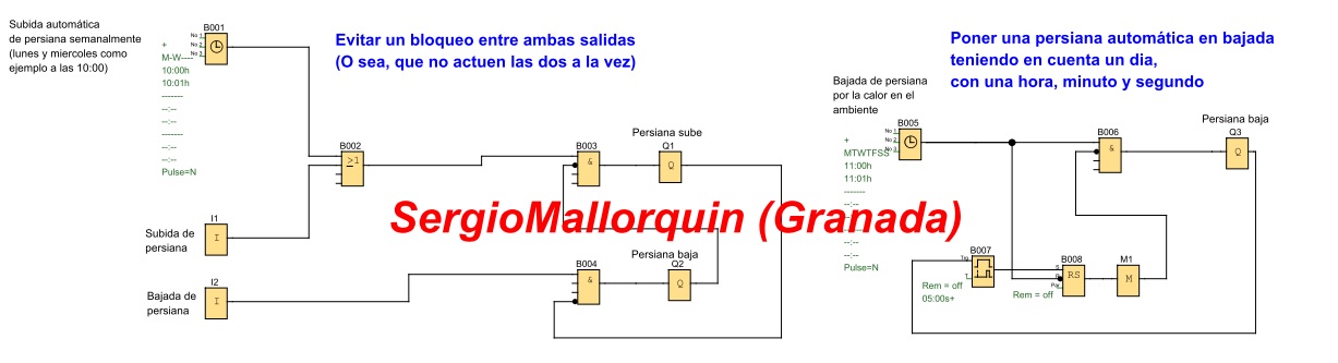 1- Interractuan dos entradas a la vez (subida y baja de persiana); Para ello lo que tienes que introducir es una puerta AND, de tal forma que las mismas salidas actuen para que impida la conexión de la misma.. Te envio la imagen para darte una pista.... [Esquema de la izquierda, te he dado la pista que necesitabas jajajja]