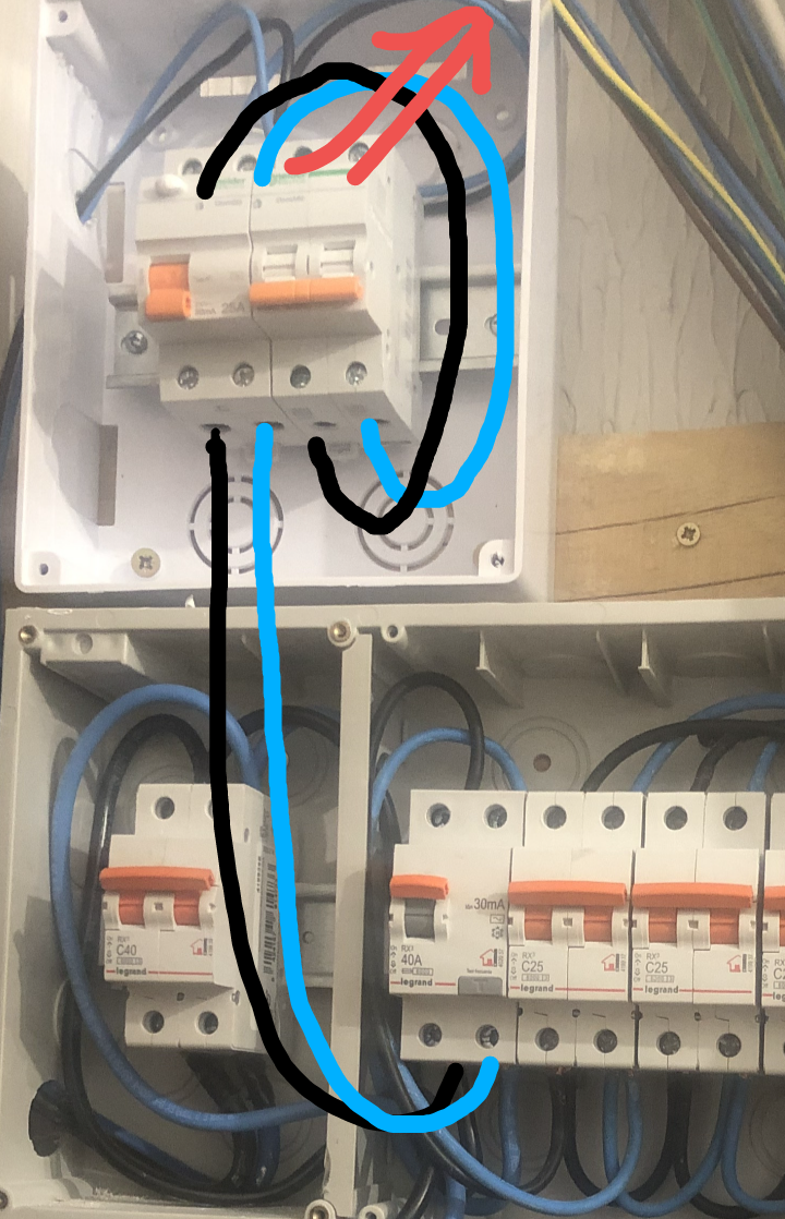 Y entonces los puentes del cuadro estarían mal? Porque de los térmicos de arriba de 25 salen cables aguas arriba que entran por abajo a los C20 de la segunda fila del cuadro de abajo.