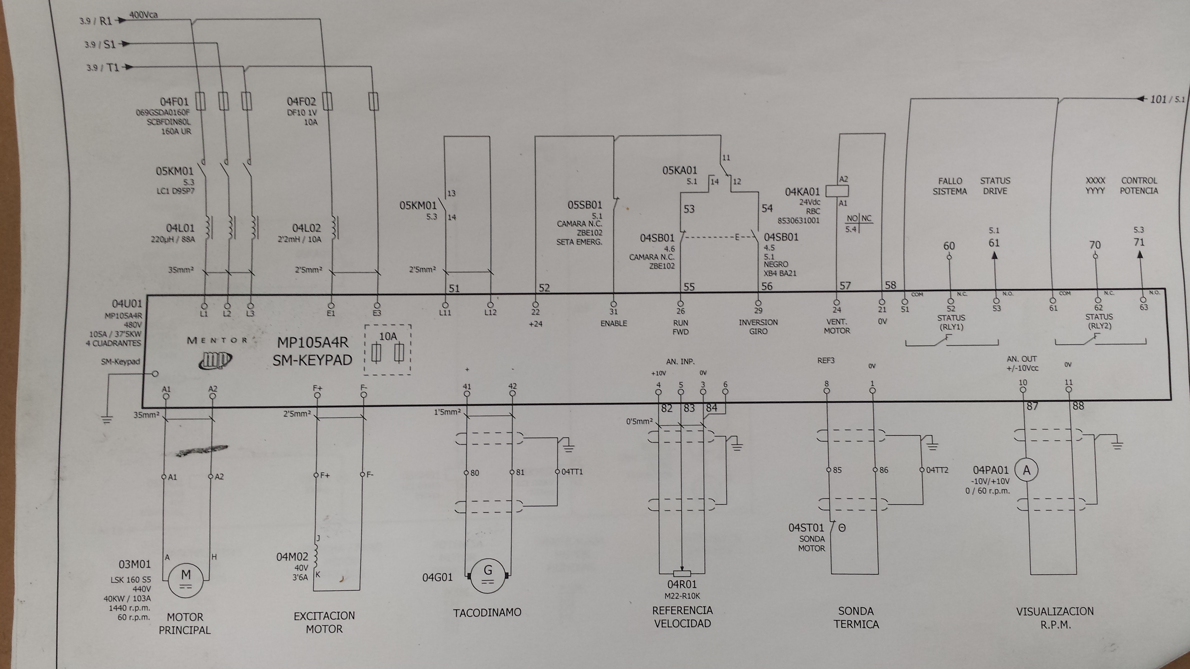 tengo una maquina extrusora que necesito conectar para trabajar con ella. Os pongo algunas fotos de los planos y tambien de la salida del cuadro y de la entrada a la maquina para ver si me podeis ayudar a ponerla en marcha.