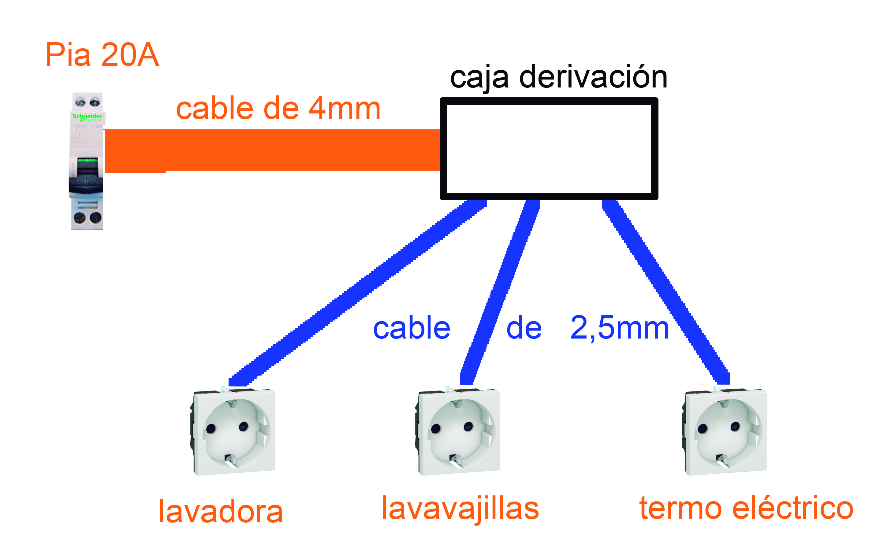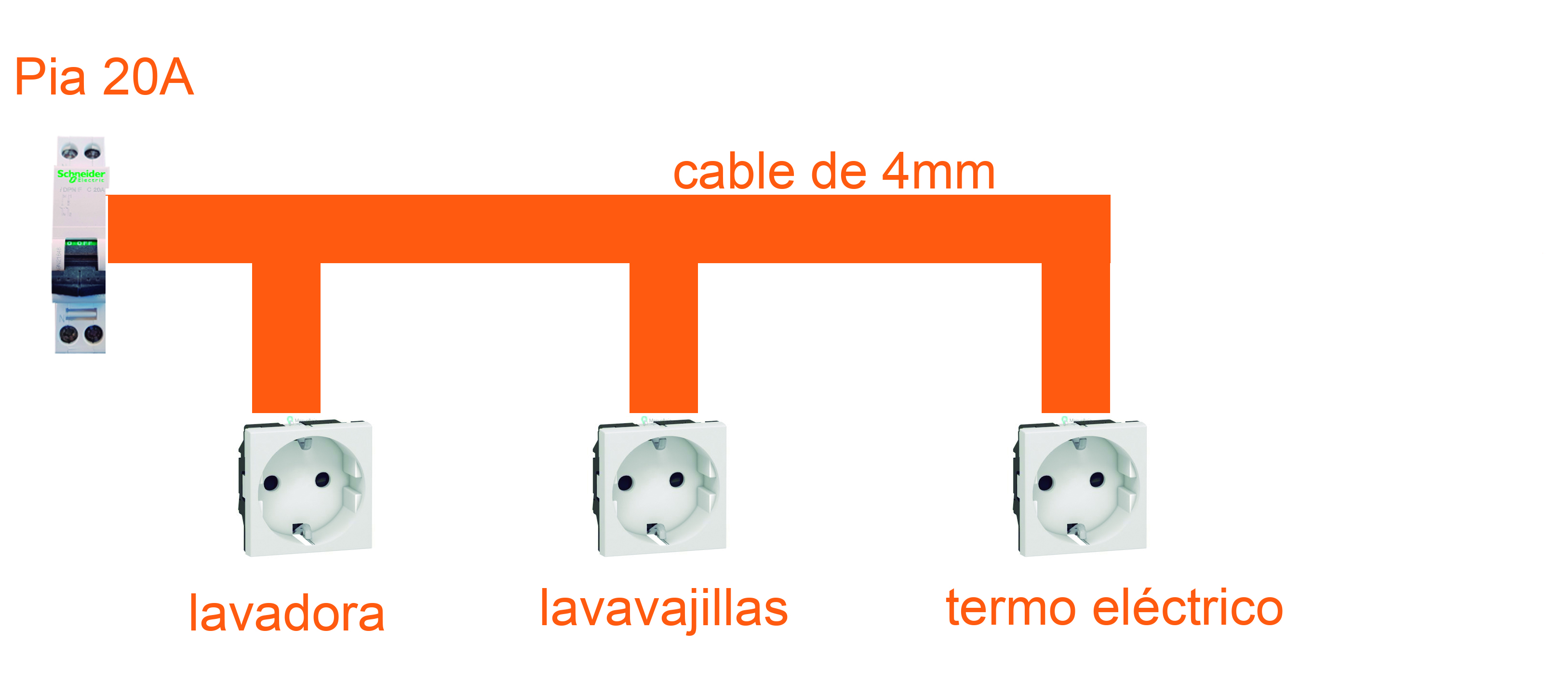 pregunta. El cable de 4mm, ¿debe recorrer toda la instalación? ¿debe llegar cable de 4mm a cada toma de 16A? Si pongo cable de 4mm en todo el circuito y los 3 electrodomésticos funcionan al mismo tiempo, sin tener las tomas de 16 fusibles ni otro tipo de protección ¿se queman?