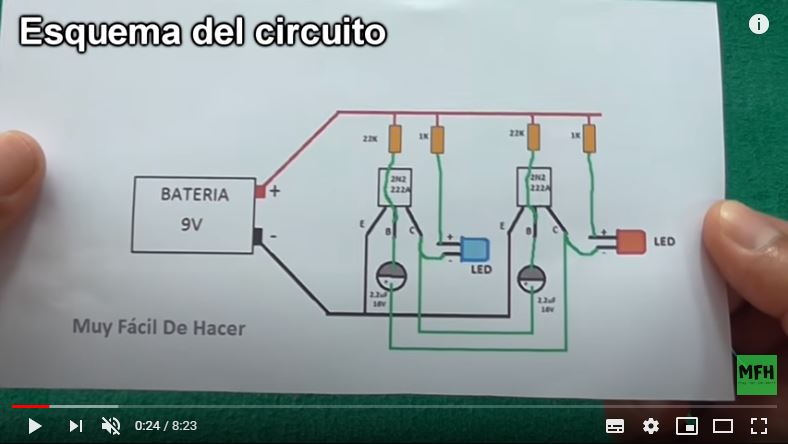 El circuito que usa se llama multivibrador astable con transistores bipolares, hay mucha informacion por la red sobre valores para frecuencias de parpadeo. El del video esta curioso, no lo he probado pero siguiendo los valores creo que va bien. Es muy importante: