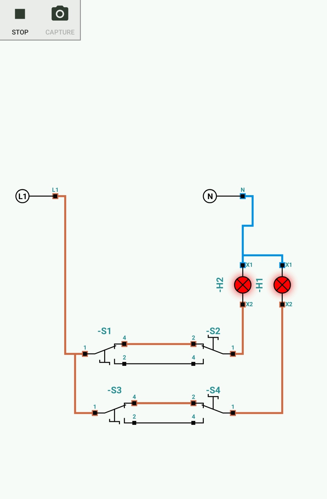 He unido 1 y 2 de cada par de llaves, y finalmente línea individual a cada punto de luz.