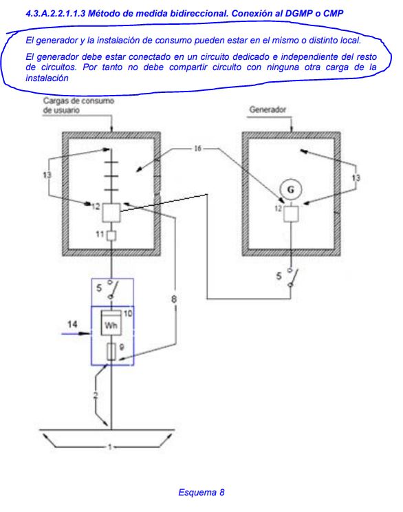 enkotec escribió:Pues por lo que he entendido de la ICT BT 40, a mi me aplican los esquemas 7 y 8 (Instalacion generadora conectada a la red interior y suministro asociado, Modo de funcionamiento independiente, Acometida de un unico usuario, Metodo de medida bidireccional), es decir con conexion en la DI o conexion al DGMP.