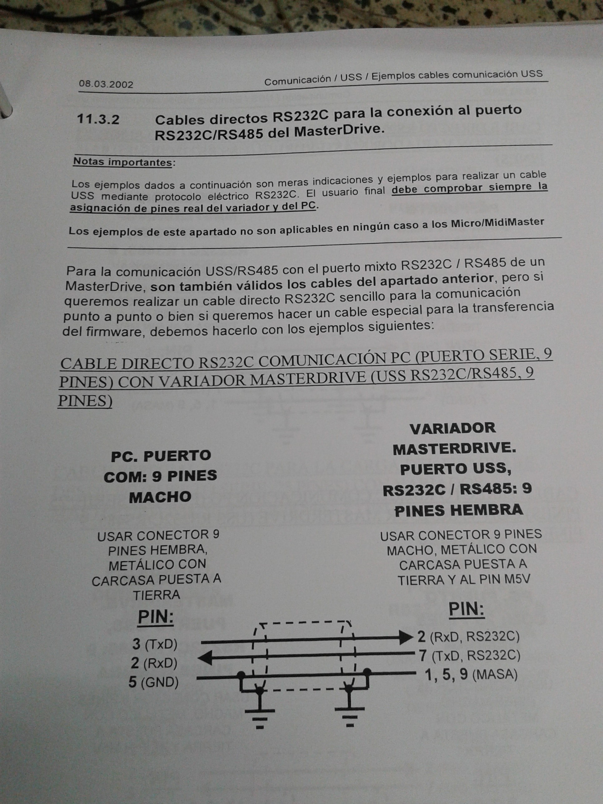 Muy bien, no voy a fotografiar todo el manual ,lo que esta claro es que esta es una conexión RS232 en la que el pinout no es "STANDAR",y te recuerdo que según dices eso no puede ser porque sino no seria RS232 seria otra cosa ,pues como ves si puede ser y esta conexión es RS232 la mires por donde la mires en ambos extremos así que te recomendaría como pone en el manual de mas arriba" comprobar la asignación de pines entre el variador y del PC"