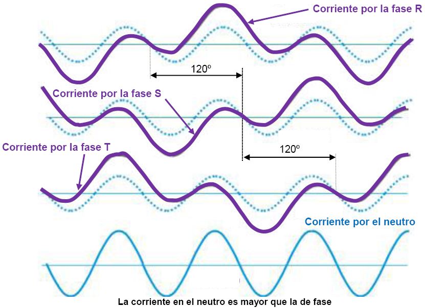 Se genera una corriente por el neutro apreciable que, además, lo calienta. Si uno se fija en la figura puede observar la corriente por las tres fases R, S, T (desfasadas 120º y en color violeta) y trazado con puntos el 3ª armónico de cada una (hay que observar que están en fase, empiezan y acaban en el mismo punto). Por este motivo, el valor de la corriente en el neutro puede alcanzar un valor superior al de la corriente de fase aunque las cargas estén equilibradas, debido a la presencia del tercer armónico (hasta un 170% de la corriente de fase).