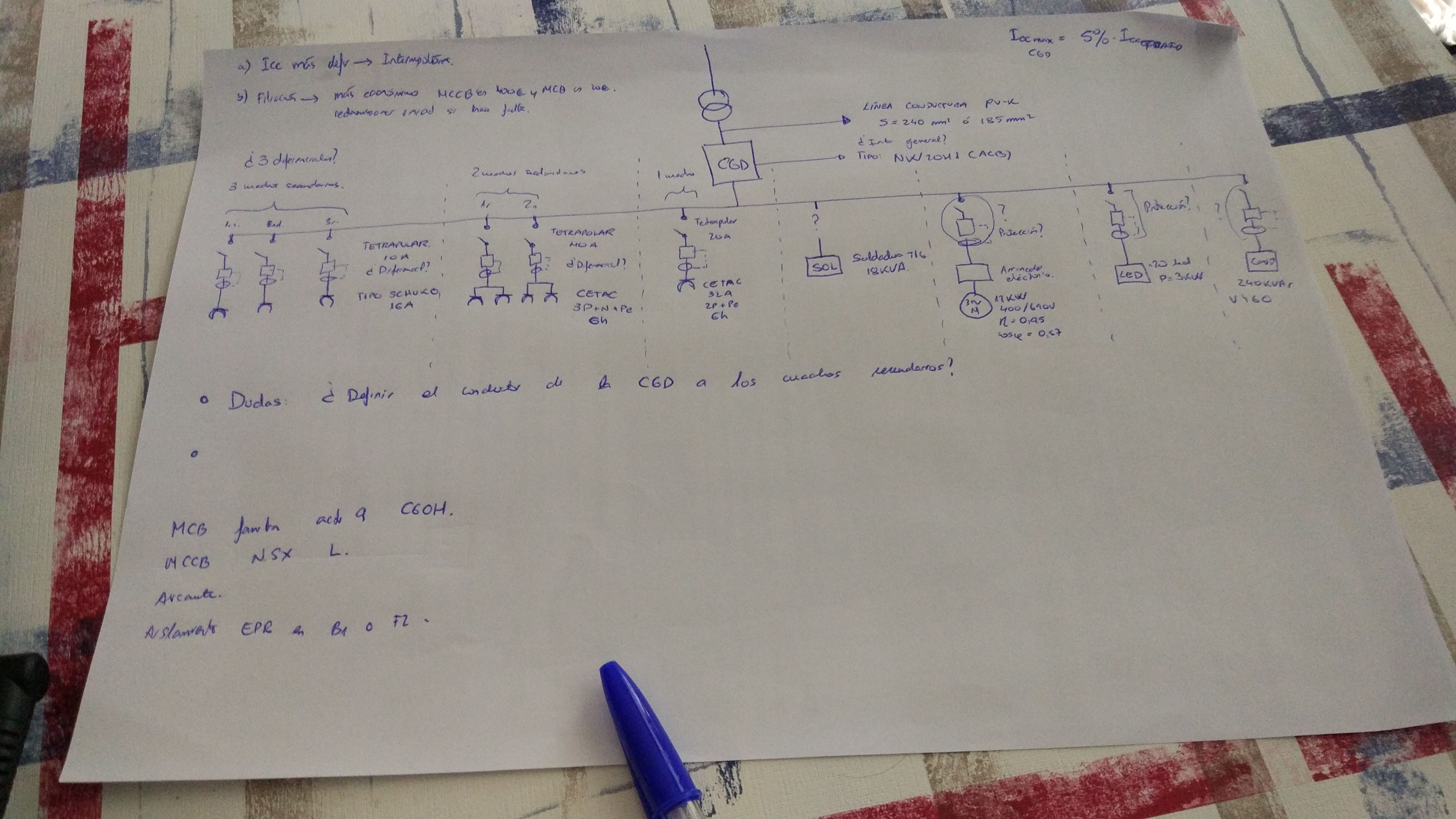Mis preguntas vienen a ser las siguientes: ¿En los cuadros secundarios añadiríamos protección individual para cada cuadro o con los del elemento añadido es suficiente? ¿Haría falta definir el cable que va desde la caja general de distribución hasta el cuadro secundario? ¿Sería necesario un Interruptor general entre la caja general de distribución y el transformador, cierto? ¿Para los elementos en los que no se indica ningún tipo de protección le añadiríamos alguna o irían "a pelo" a la red?