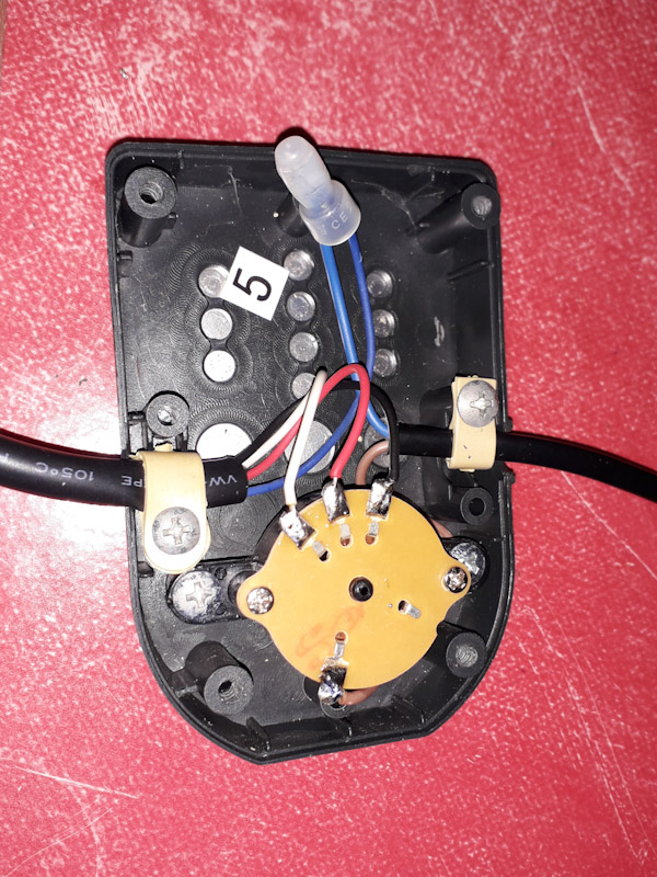 Lo que me llamó la atencion es la conexión original de los cables al selector. Los cables que llegan del enchufe, el azul iva al común del selector y el marrón se conectaba directo con el negro que sale.