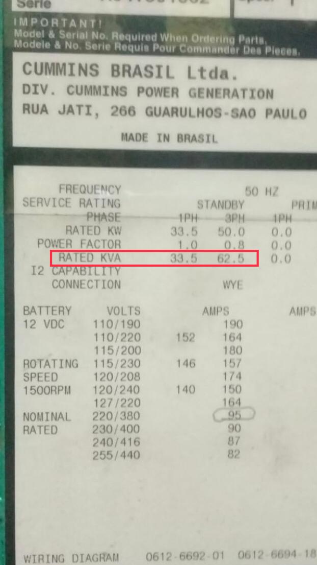 [font=Verdana, Arial, Tahoma, Calibri, Geneva, sans-serif]Buen día! Hace unos días consulte a un especialista sobre un generador que tengo Cummins y me comento que era de 110 KVA. Mi duda es que en la etiqueta del frente del equipo (ADJUNTO FOTO) dice 62.5 KVA y al volver a consultarle me comento que si, que efectivamente es de 110KVA, pero nunca termine de entender por que dice eso en la etiqueta y por que significa 110 KVA. Desde ya muchas gracias a quien pueda darme una mano y confirmandome que sea lo que él dice.[/font]