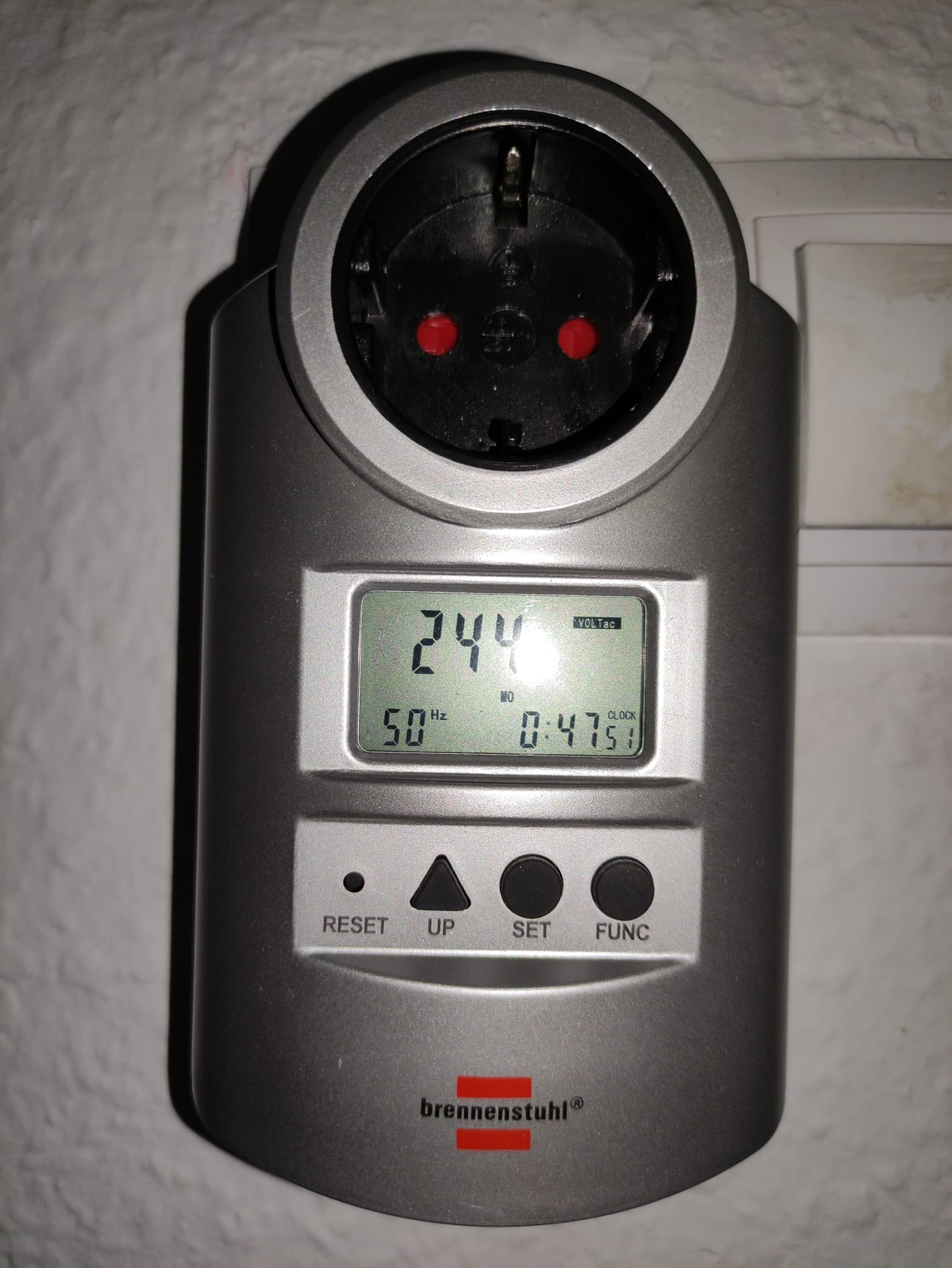 -He realizado lecturas de la tensión en el contador inteligente y dentro de casa con un enchufe con medidor, y suele rondar los 241V. En la foto adjunta se llegan a ver 244V.