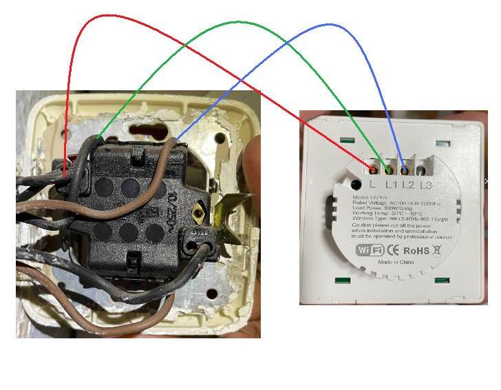 El nuevo que quiero poner (imagen 2 Nuevo domóticohttps://500px.com/photo/1043699111/IMG9086-by-Javier-ote), obviamente tiene dos botones también, pero la parte trasera es así, y sinceramente no sé donde poner cada cosa, tengo claro qué pondría en L1 y L2 pero poner todo lo demás en L se me hace mucho ¿no?