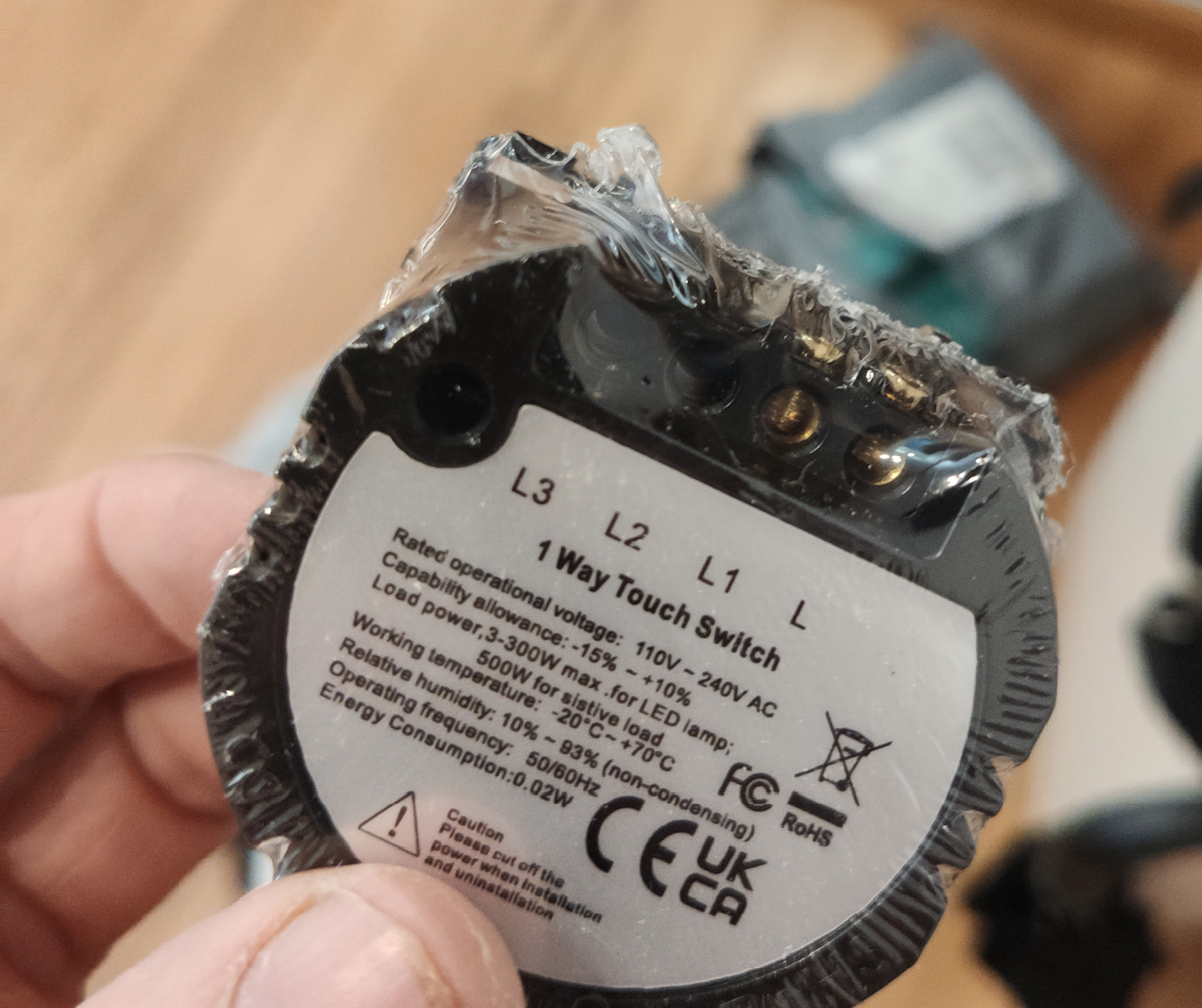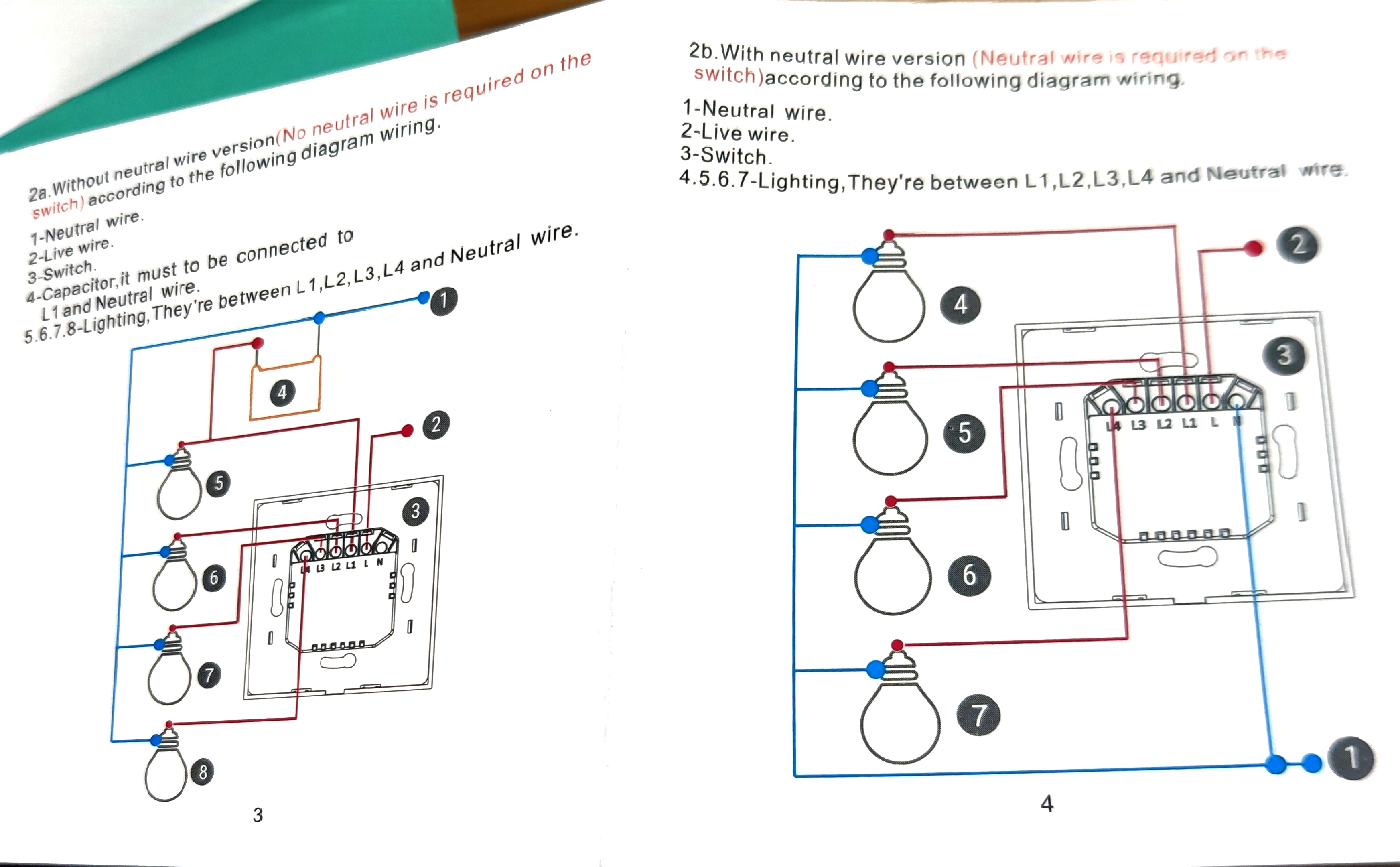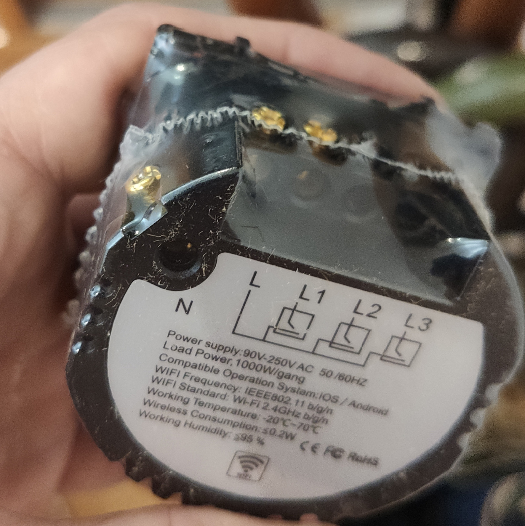 Así que ni corto ni perezoso (y en un alarde de ignorancia) compre tres interruptores simples (con entrada L y L1), y uno doble wifi (me refiero a que tiene dos botones independientes, con entrada L, L1 y L2), ninguno con neutro.