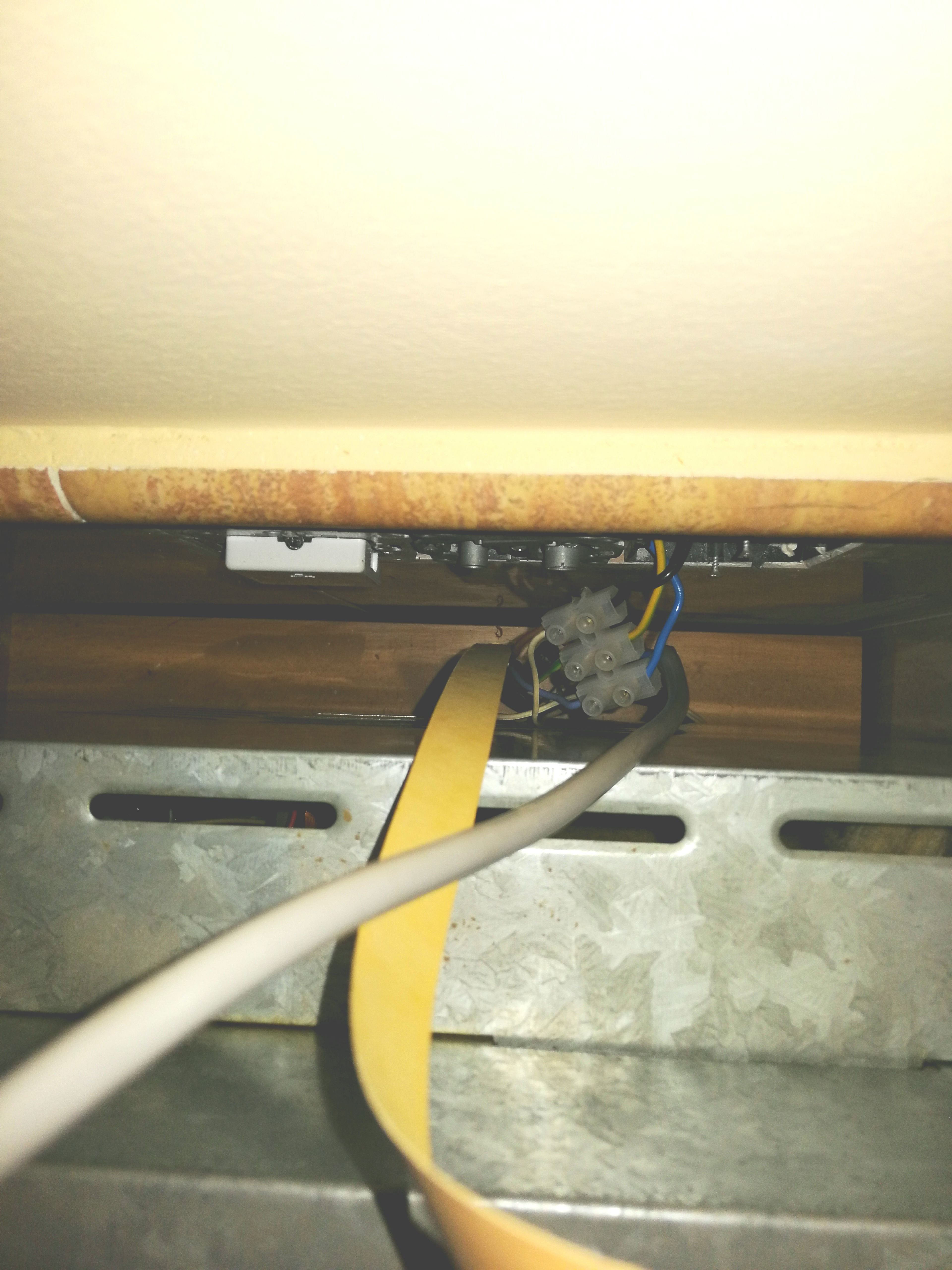 Desmonté el marco del viejo, unas piezas de plástico que encajaban en las patas, lo saqué de su sitio, iba a desenchufarlo y me encontré con que no había enchufe (adjunto una foto, el cable de alimentación del micro es el gris). Mis conocimientos de electricidad son muy limitados, así que metí la cabeza por el hueco y vi que tanto el micro como el horno eléctrico que está debajo van conectados directamente a una regleta, que a su vez va conectada a unos cables que salen no sé muy bien de dónde. En resumen, tengo un micro nuevo con enchufe, pero no hay dónde enchufarlo. ¿Podríais, por favor, decirme si la instalación del micro y del horno eléctrico es correcta tal y como está?, ¿cómo podría solucionar la instalación del nuevo micro? Si es complicado, buscaré un profesional que lo haga, pero me gustaría saber qué es lo que hay que hacer.