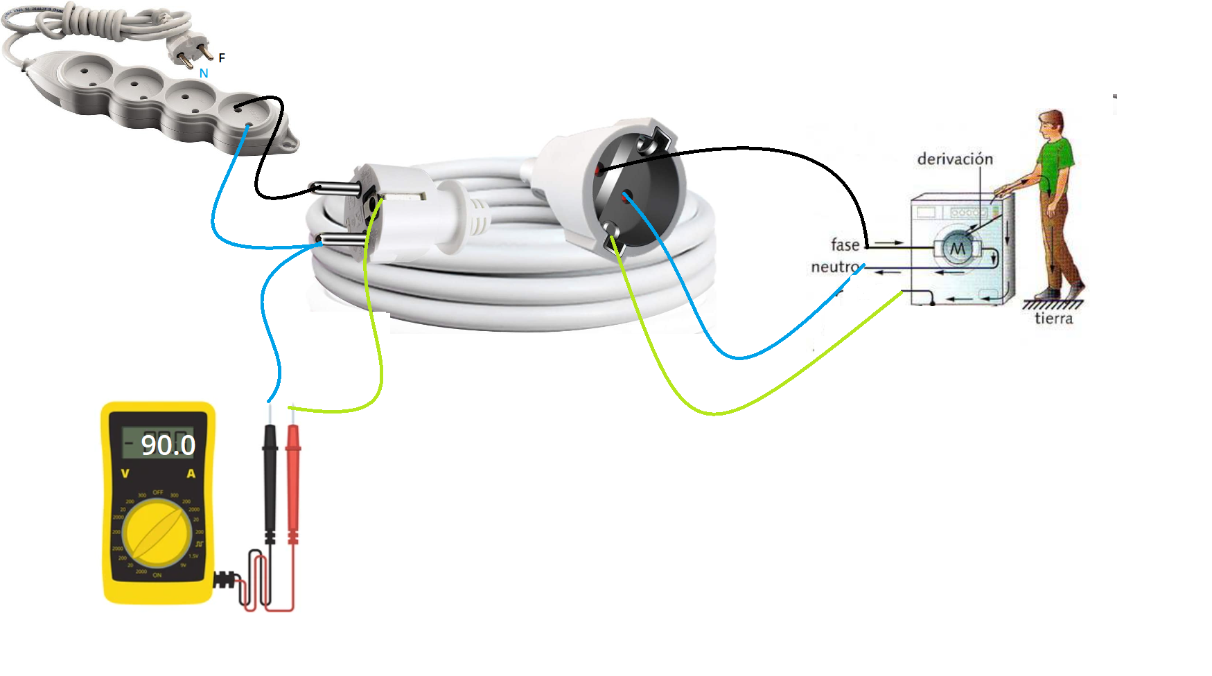Conecto un alargador sin toma de tierra a un enchufe de mi casa, y a éste conecto otro que sí tiene toma de tierra (para una conexión provisional, necesitaba un alargador de 10 metros, y solo tenía dos de 5, uno con y otro sin toma de tierra). Mi sorpresa ha sido que al comprobar con el buscapolos, éste se encendía al tocar en el terminal de tierra del alargador, además de en la fase. Entonces he probado con el multímetro, y me daba una tensión entre el neutro y tierra de unos 90 voltios. Me pregunto como es esto posible, si el cable de tierra no está conectado en el otro extremo.
