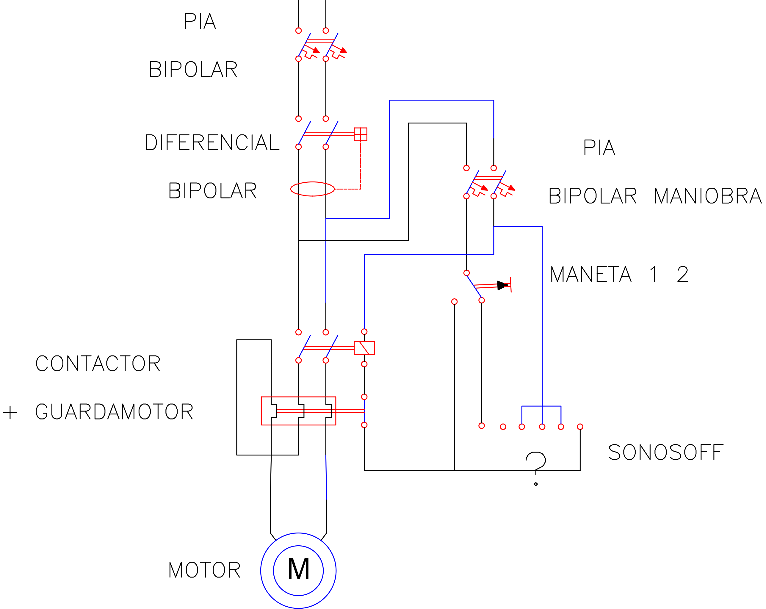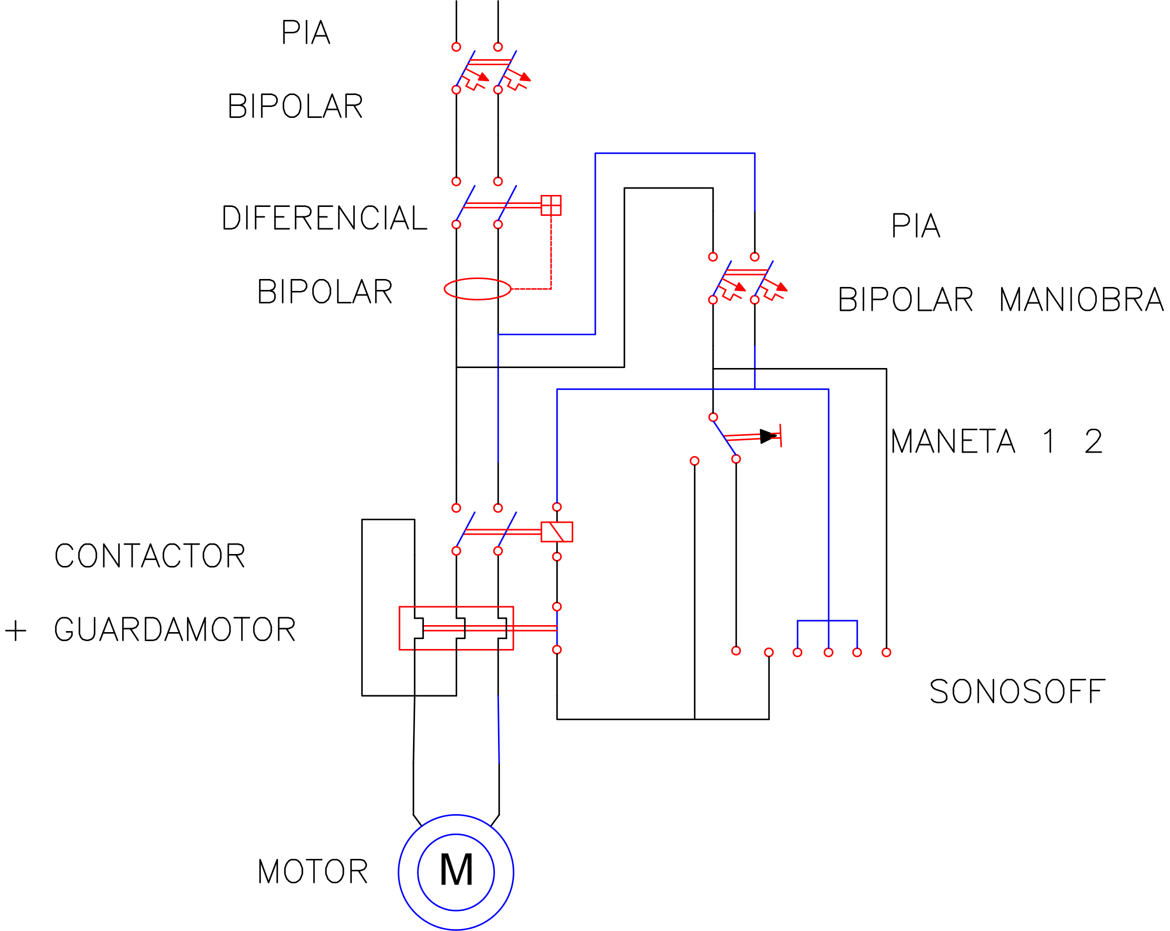 Así seria mas o menos, te faltaría un contactor y un guardamotor adaptado a la intensidad del motor. Pongo una interrogación en lo que puse Sonosoff, pero en la imagen no se distingue lo que es cada L, tendría que ser una imagen mas grande...