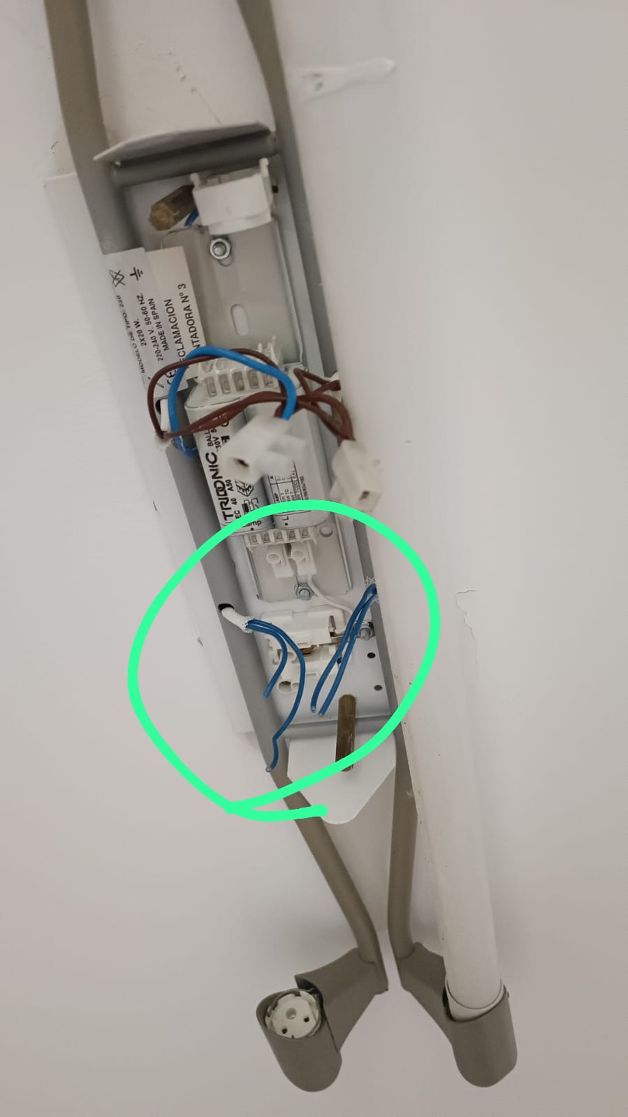 Me han reparado el techo de la cocina y creo que han montado la lámpara con 2 fluorescentes mal ya que cuando doy la luz salta el limitador.