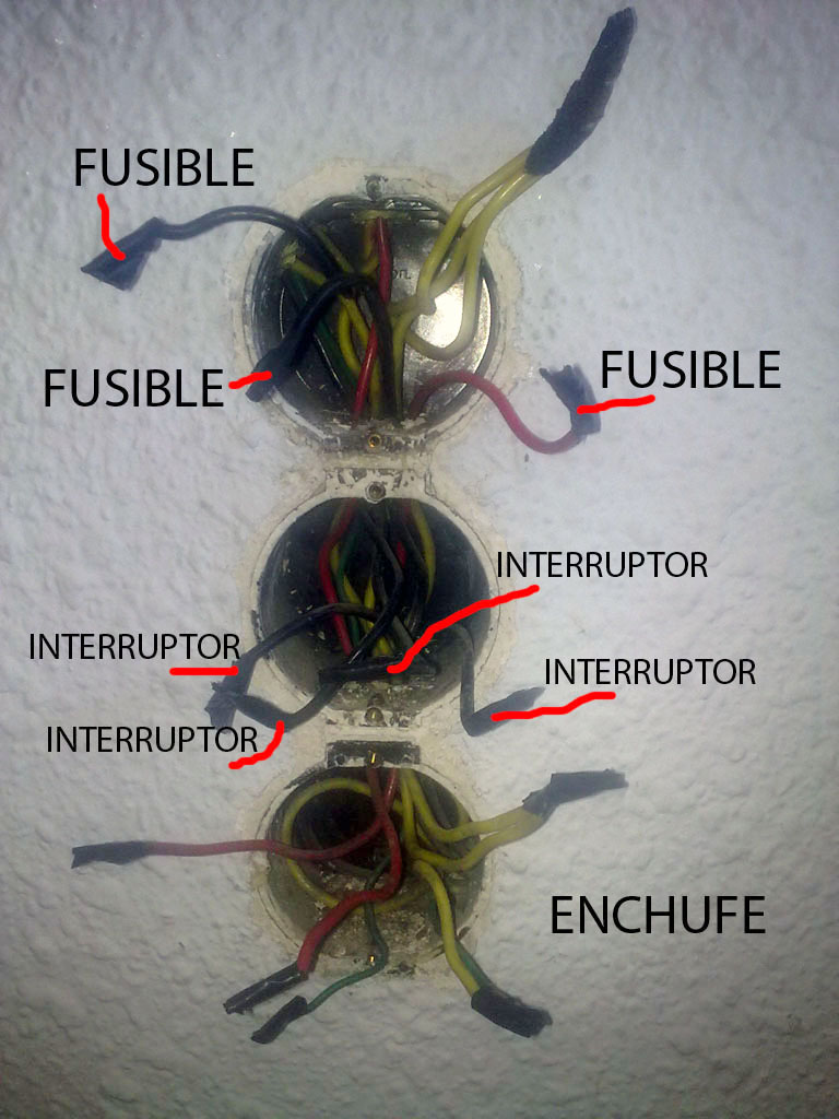 Os he puesto los cables que iban conectados al fusible y al interruptor. Los del enchufe son todos lo de abajo, pero no recuerdo como iban conectados, por eso no os he puesto lineas. El cable amarillo y verde que están unidos con cinta aislante los he unido yo, porque creo (y solo creo) iban juntos.