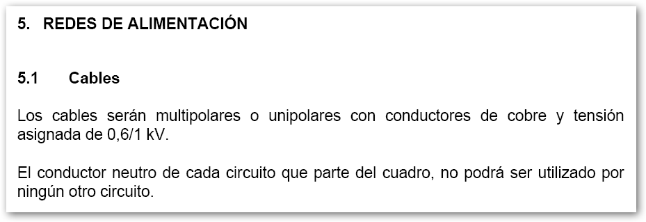 Los cables serán multipolares o unipolares con conductores de cobre y tensiones nominales de 0,6/1 kV.Si seguimos más abajo, podemos leer: