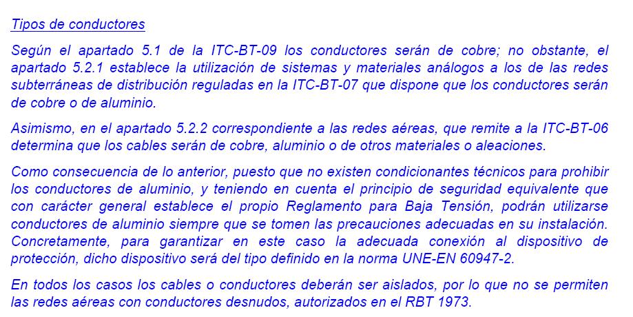 Los conductores utilizados en las redes aéreas serán de cobre, aluminio o de otros materiales o aleaciones que posean características eléctricas y mecánicas adecuadas y serán preferentemente aisladosAdemás de eso, si nos vamos a la "Guía Técnica de Aplicación Instalaciones de Alumbrado Exterior", podemos leer: