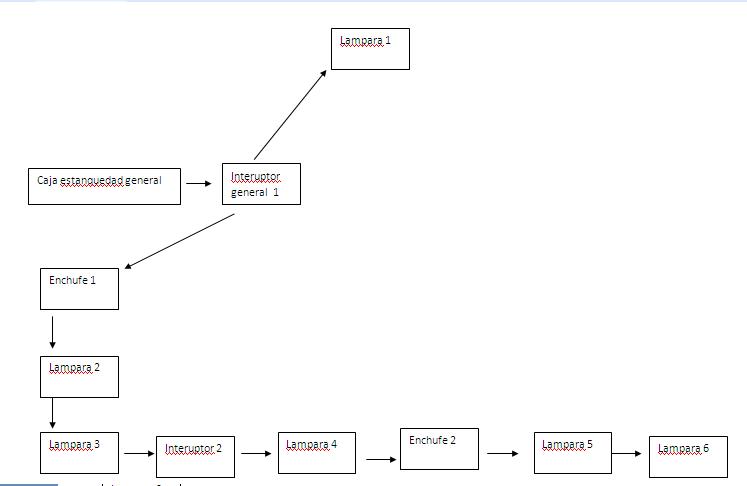 Caja estanquidad general -> interruptor general -> lámpara 1 -> enchufe -> lámpara 2 -> lámpara 3 -> interruptor 2 -> lámpara 4 -> enchufe -> lámpara 5 -> lámpara 6.
