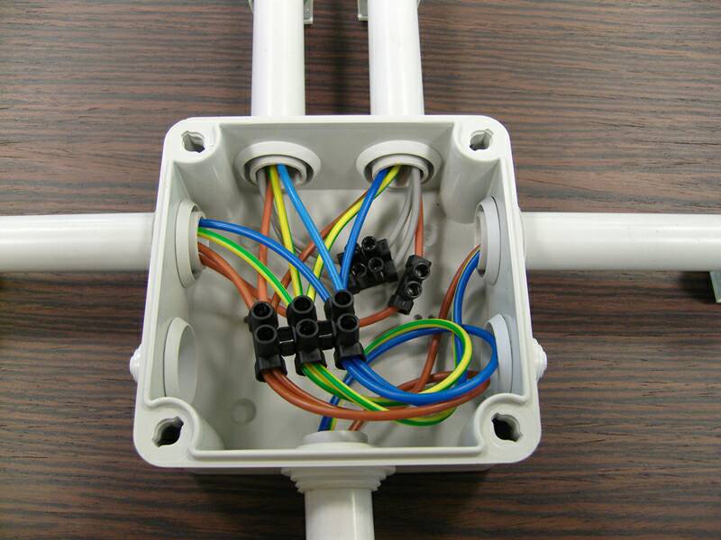 La imagen muestra una pieza de union o dado de conexion (no se como se llama en tu pais) donde llegan 3 cables,por arriba se hace un salto que ira a otro receptor, 3 son rojo, 3 son azul y los del medio son los de tierra.