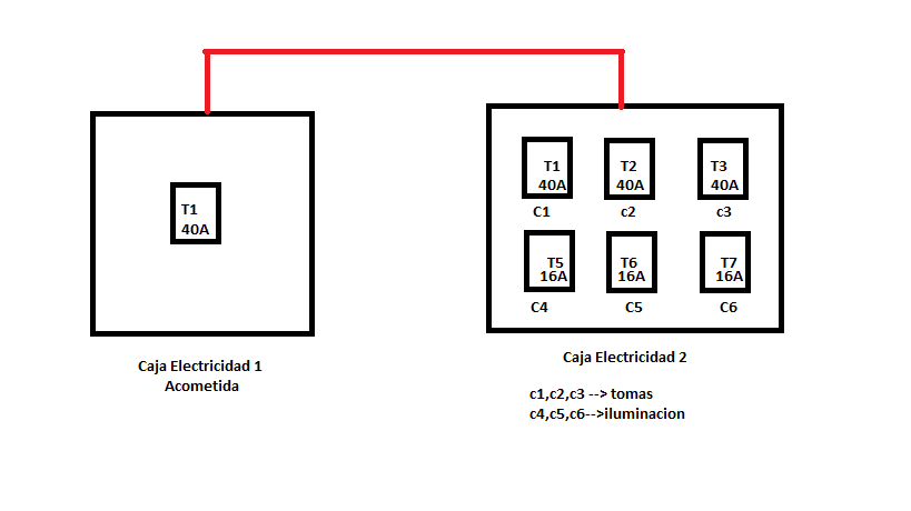 Buenas noches, tengo en mi obra domiciliaria 2 cajas de luz, la primera es la que esta conectada al cable de la palma y de la primera sale un cable hacia la segunda caja que es donde están los circuitos de mi hogar. Les quería consultar cuantos disyuntores necesitare en cada caja?? o con un solo disyuntor en la primer caja me alcanza. Les adjunto un dibujo sin los disyuntores.