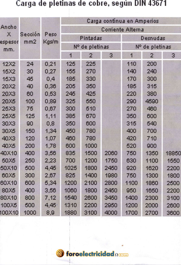 Tabla de I máxima admisible de las pletinas de cobre según sección.