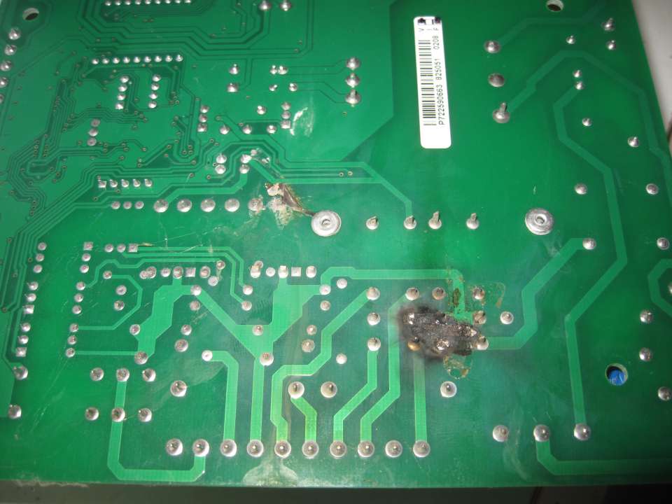 de los componentes negros verticales de tres patas a cualquiera de los otros componentes con mas patas, normalmente suele también fundirse algún fusible asociado, muchas veces es inpercetible o muestran un pqueño poro en su cuerpo. por una sobretensión no les pasa nada a las pistas, necesitan mucha corriente, mucho tiempo (mas de un segundo) para que se denote quemado. un componente electrónico ya se pasivo(resistencias) o semiconductor(transistores, triacs, tiristores, igbt, integrados,...) necesitan milisegundos para quemarse. si fuera una fuente conmutada además llevan varistores en el bus de continua de alta tensión que protege mejor el sistema, en este caso es una fuente lineal, el propio trafo hace de filtro por no permitir el paso de pico de tensión( alta frecuencia) protegiendo todo lo que este en el secundario. lo malo de esto es que es muy probable que se queme el trafo (muy caro) antes que la electrónica (componente a componente muy barato). habría que saber que pone en cada componente para estimar cual seria el primero en caer, pero es mas que seguro que rompería antes por la zona de 220v componentes como el trafo o asociados a el. por sobretension las pistas no se ven afectadas, es muy corto de tiempo y no le da tiempo. es mas aunque alimentásemos esa placa a 380v, quemaríamos el trafo y algún componente electrónico, claramente veriamos en la parte de los componentes como la placa esta un poco negruzca por alguna resistencia que se puso al rojo vivo, o manchada por reventar condensadores pero la zona de las pistas estaría intacta.