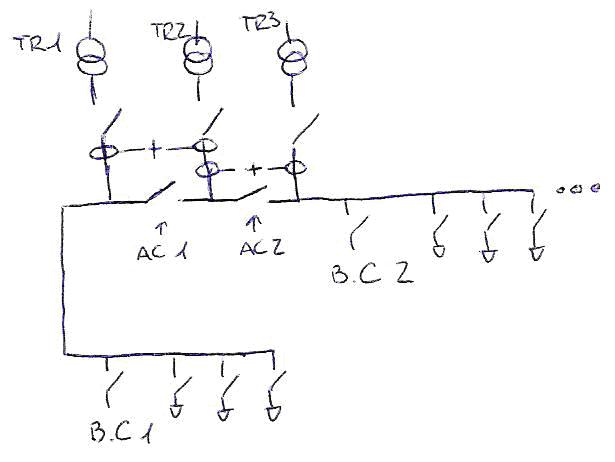 Hola a todos. El otro dia me encontré una instalación que me llamó la atención y quería saber que opinais. El caso es que había tres transformadores en paralelo a través de dos interruptores de acoplamiento en baja (sin ningún tipo de enclavamiento entre ellos) de tal forma que el personal de mantenimiento del sitio en cuestión alimentaba dos zonas por separado a través de dos de los trafos (sin estar acoplados) y el otro lo dejaba quitado.