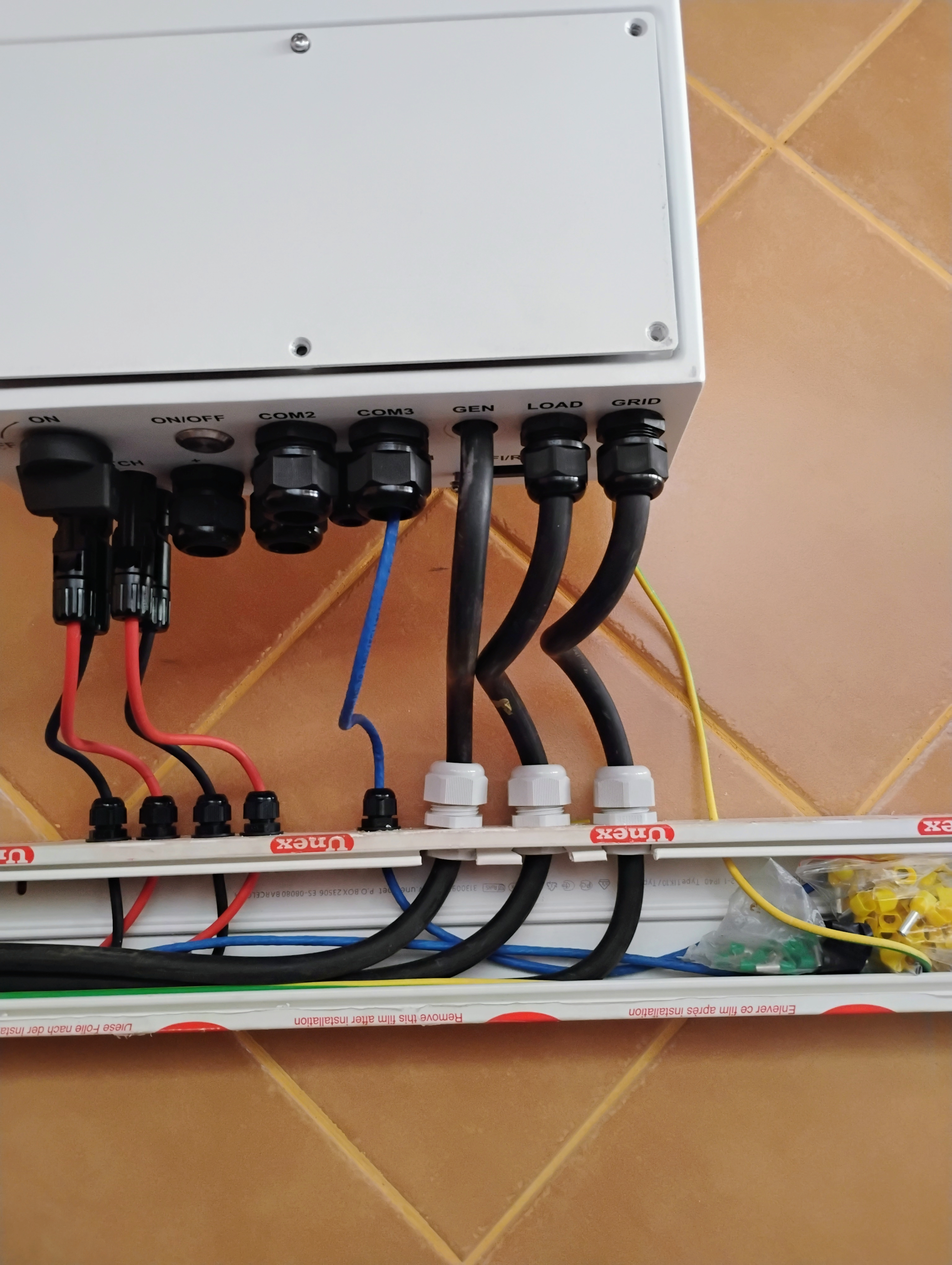 La conexión del equipo es unicamente a su entrada GRID , tengo como se verá en las fotos también conectadas las otras dos entradas LOAD y GEN PORT pero unicamente las puntas de las lineas si bien estan conectadas a un PIA es como si estuvieran encintadas.
