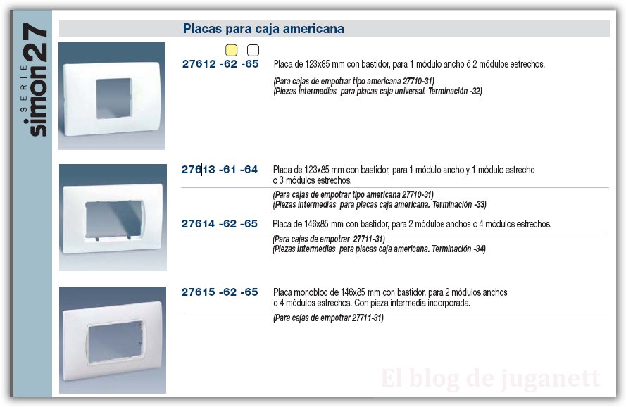 Esos mecanismos son de la serie Simon 24 el ultimo catalogo donde aparecen es del año 1988. Las cajas son de una medida especial que creo que no concuerdan con la americana, si quieres mideme la distancia entre taladros exacta entre los tornillos de fijacion de los soportes, (los dos que estan fijando el soporte mediante unos agujeros ovalados) y te confirmo si valen las cajas de la 27 o de la mosaic 45 de Legrand) si me das tambien las medidas del hueco de la caja te lo miro, creo que tengo por ahi alguna caja de estas.